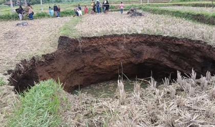 Sebidang sawah yang semula tampak normal dan siap dibajak, tiba-tiba amblas ke dalam tanah dan membentuk lubang raksasa atau sinkhole.